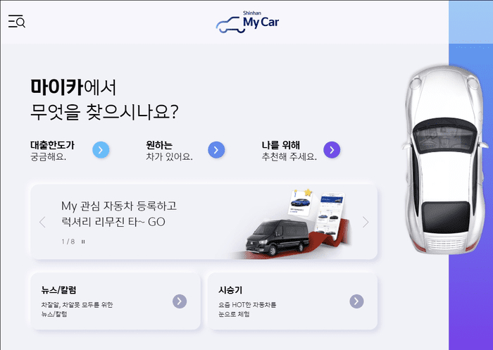 그 안에는 자동차 관련 금융을 필요로 하는 고객들을 위해 최적의 상품을 제안하며 차별화가 이루어진 제휴 서비스를 제공하는 목적으로 자동차 관련 플랫폼들을 통합한 ‘마이카 대출’이 있습니다.